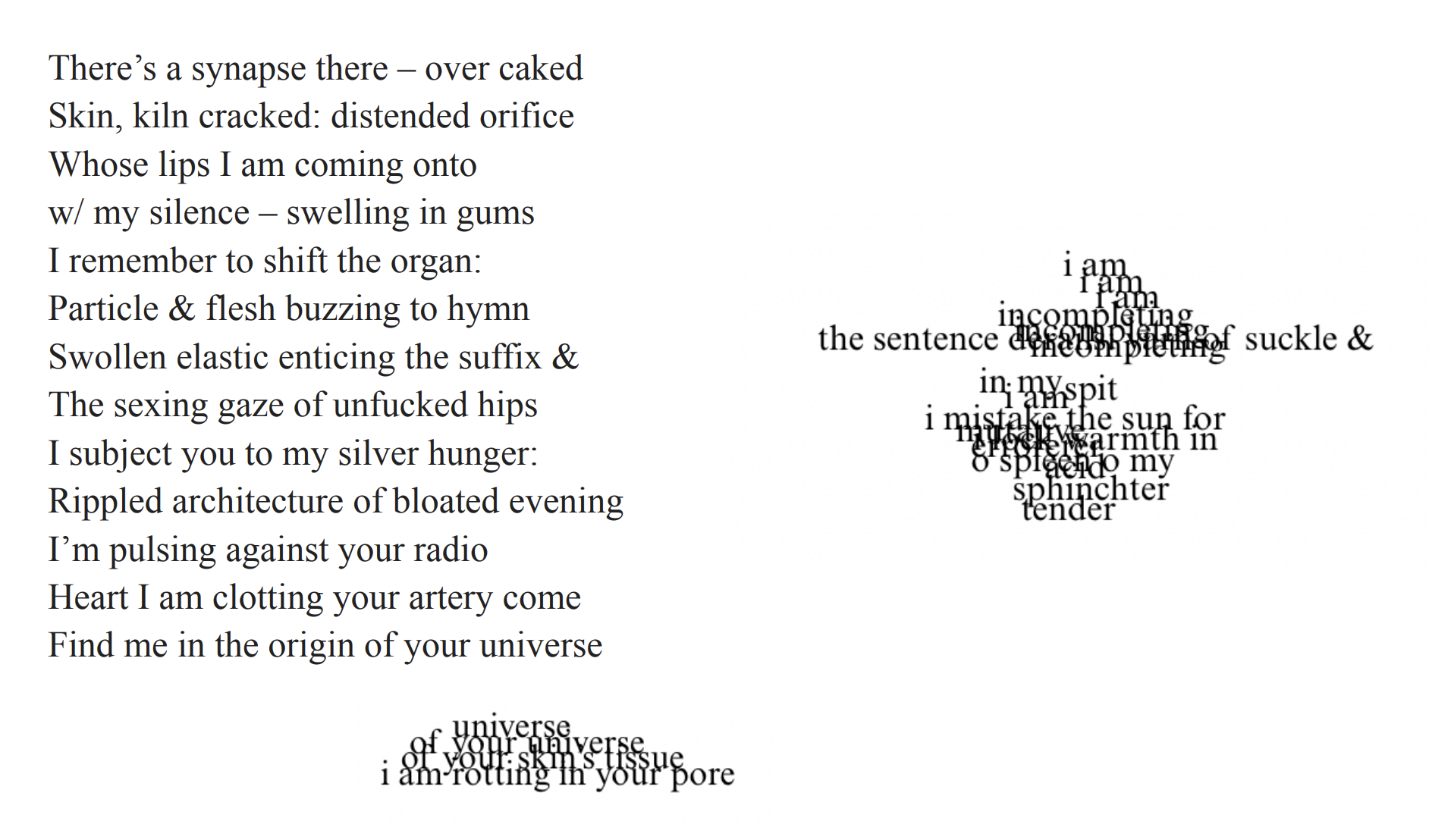 Rina Shamilov is a queer poet and visual artist from Brooklyn, New York, born to Soviet immigrants. Her chapbook, My Mother's Armoire, was published by Bottlecap Press. Her manuscript, Hungering: Dance of the Figurines, has recently been named a finalist in Black Lawrence Press' Immigrant Writing Series contest. She is a nonfiction editor at MAYDAY and a reader for Fence Books. Her recent work can be found (and is forthcoming) in Ritual Dagger, Art of Nothing Press, Antiphony Press, The Laurel Review, Kismet Magazine, and Ranger, among others. The Academy of American Poets has recognized her work, and she received a Best of the Net nomination.